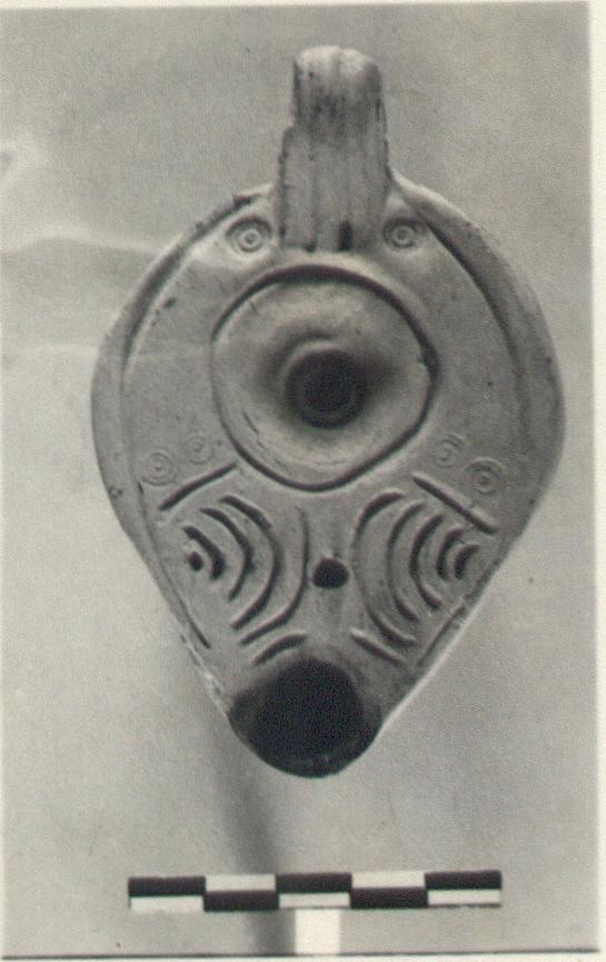 | Description: | Intact. Plain rim with a stamped circle either side of handle and two either side of grooves separating neck (ornamented with concentric curved lines) and rim. Solid handle, double grooves in front, triple behind. Circular reverse with double concentric grooves enclosing signature:"T". Lower parts of sides have horizontal grooves, and other grooves set off the nozzle. Unglazed. Pinkish-buff clay. Type XXVIII of Corinth collection. | |