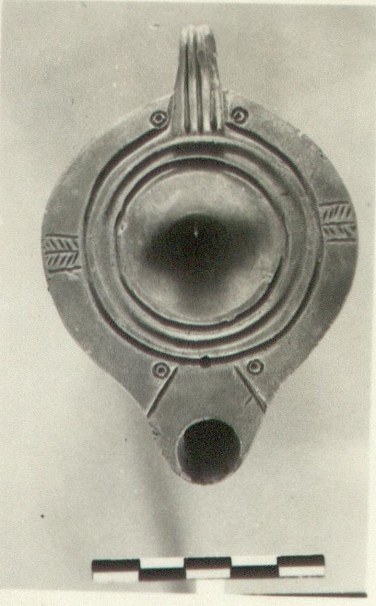 | Description: | Intact. Discus, plain; rim, plain, with herringbone panels and small circles at handle and nozzle. Handle grooved triply above, doubly below; unpierced. On reverse, small palm branch within two deep concentric grooves. Good purplish wash. Light red clay. Type XXVIII of Corinth collection. | |