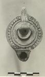 | Description: | Part of right side broken away. On discus, crescent; on rim, raised dots. Handle, unpierced, grooved, double above and below. On reverse, concentric grooves. Glaze wash dull red and flaky. Buff clay. Type XXVIII of Corinth collection. | |