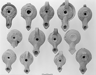 | Description: | Handle, part of walls, whole end of nozzle missing. Roughly oval, slightly concave base; ribbed rim, with rosette in relief at right, a bar-like object at left side. Type XVIII of Corinth collection, type 52B of Agora collection. | |