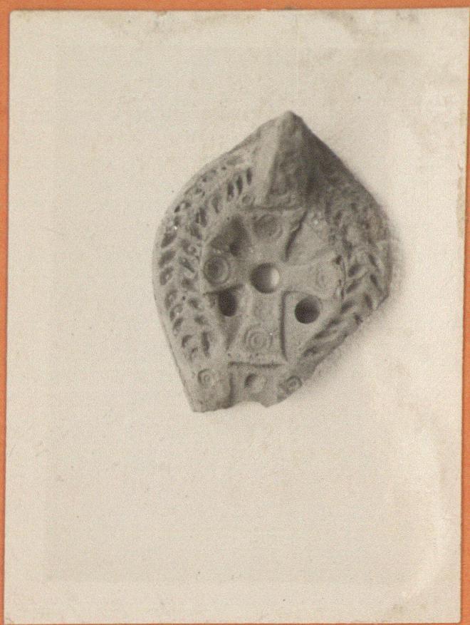 | Description: | Fragment of top. On rim, herringbone, with a small double circle on either side of the nozzle. On discus, cross, with double circles; two oil holes; two others, and one on the neck, indicated but not pierced through. Handle, solid, defaced. Unglazed. Light red clay. Type XXVIII of Corinth collection. | |