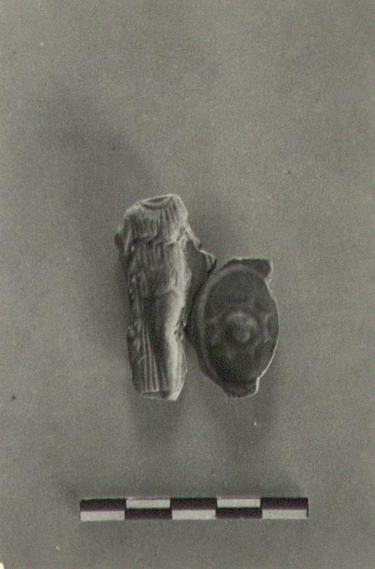 | Description: | Fragment only of discus preserved, with draped standing female figure, facing. At her left, a shield with gorgoneion. Thin reddish-brown glaze. Brownish-buff clay. Type XXII of Corinth collection. | |