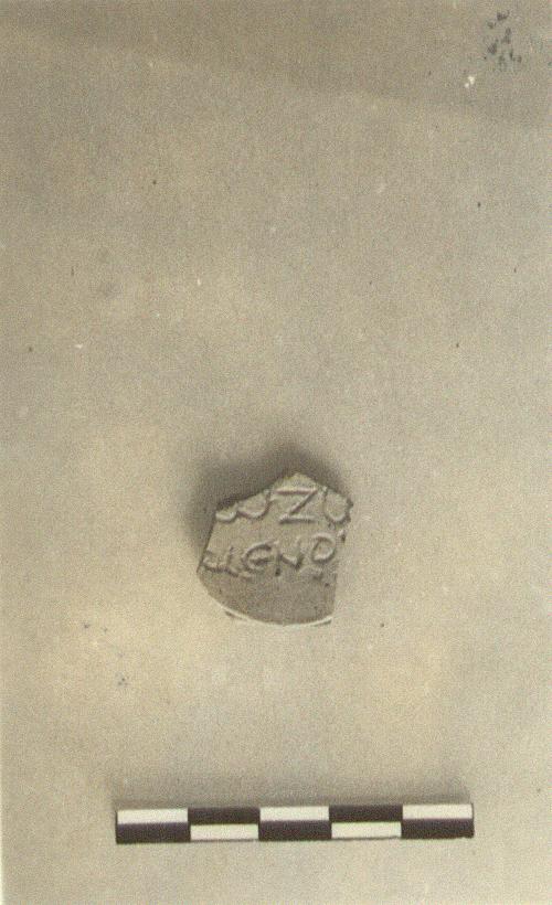 | Description: | A small fragment from the bottom, with the signature written in the wet clay. Unglazed. Pinkish-buff clay. Type XXVII of Corinth collection. <graphic> | |