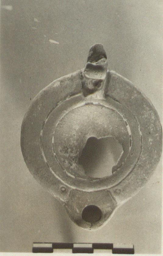 Plain rim and discus, with a band between them. A small impressed circle on each side of the nozzle.
