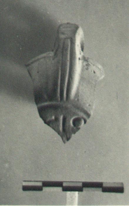 | Description: | Part of reverse and handle preserved. Pierced and double grooved handle. Large circular reverse enclosed by single groove. Signature on bottom. Light red clay and wash. Type XXVIII of Corinth collection. <graphic> | |