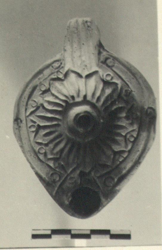 | Description: | Intact. Rim has single circular groove, and three stamped circles on each side. Rosette on discus, with pointed petals. Solid grooved handle. Almond-shaped reverse with double grooves, enclosing palm branch. Unglazed. Red clay. Type XXVIII of Corinth collection. | |