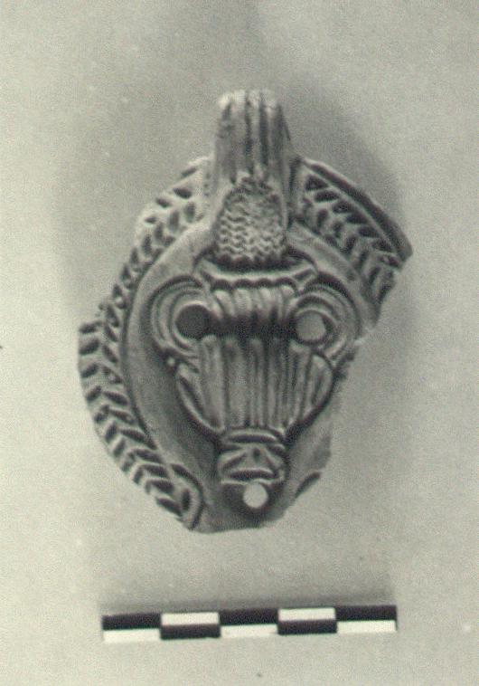 Narrow rim with three tiny stamped circles on each side; three smaller circles on each side of the ridge separating rim and discus, where there is a rosette. Solid grooved handle. Circular reverse enclosed by concentric grooves.