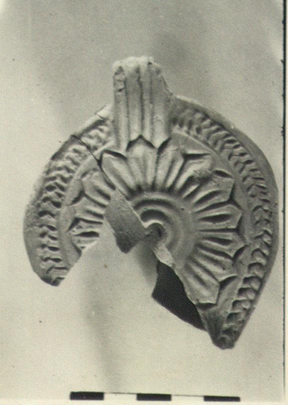 | Description: | Half preserved, with handle. Herringbone pattern on rim, rosette with pointed petals on discus. Solid grooved handle; circular reverse with double concentric grooves enclosing signature: "E". Light red clay and wash. Type XXVIII of Corinth collection. | |