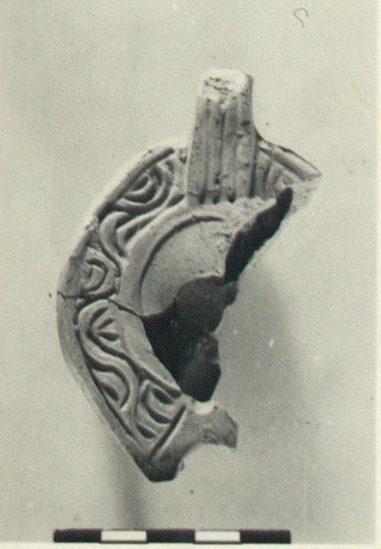| Description: | Half preseved, with handle and part of nozzle. Wavy lines on rim, plain discus. Solid grooved handle, circular reverse with double concentric grooves enclosing letter " Ω". Light red clay and wash. Type XXVIII of Corinth collection. | |