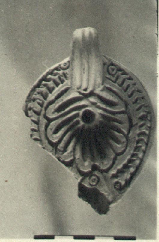 | Description: | Intact except for nozzle and part of rim. Herringbone pattern on rim, stamped circles either side of solid grooved handle and nozzle. Shell on discus; circular reverse with crossed palm branches stamped circles in corners. Unglazed. Buff clay. Type XXVIII of Corinth collection. | |