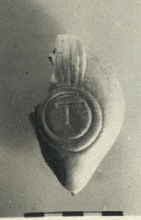 | Description: | Left side preserved, and all of reverse. Herringbone pattern on rim, rosette on discus; solid grooved handle; circular reverse with double grooved lines enclosing letter "T". Red clay and wash. Type XXVIII of Corinth collection. | |