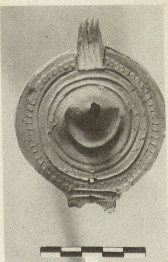 | Description: | End of nozzle broken away; otherwise intact. On discus, crescent. On rim, single row of raised dots. Handle, partly pierced for easy gripping, one higher than the other; grooved above triply and doubly below. On reverse, concentric grooves. Unglazed. Red clay. Type XXVII variant of Corinth collection. | |