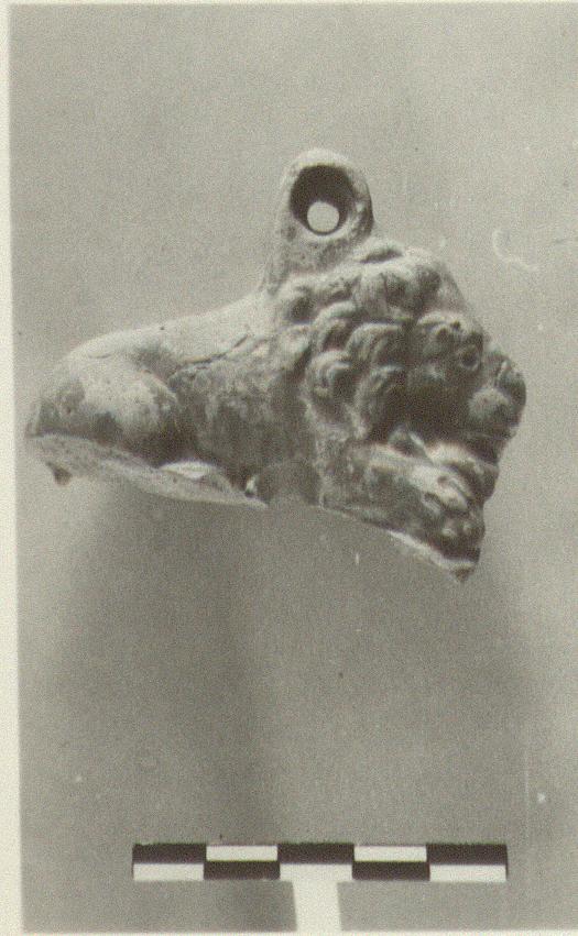 | Description: | Lower part, including body of lamp, broken away. A lion lying down. Eyes pierced. Pierced suspension handle at top of head; filling hole at side, below lion's right leg. Red glaze inside and out. Buff clay. | |