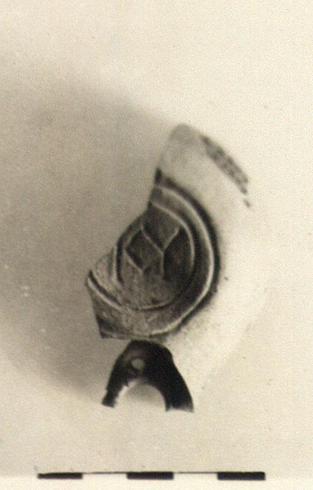 | Description: | Left half preserved, without nozzle or handle. Herringbone pattern on rim, whirling rosette on discus, with tiny dots around its periphery. Circular reverse with double concentric grooves enclosing signature:"K Y". Red glaze, burnt black. Red clay. Type XXVIII of Corinth collection. | |