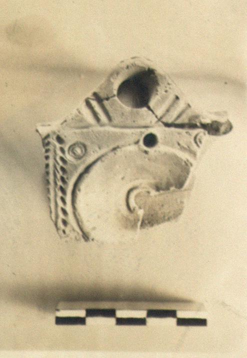 | Description: | Part of one discus and nozzle preserved from a lamp forming part of a series of three (?) type XXVIII lamps joined side by side. Plain discus; palm branches separating disci; stamped circles in spandrels; small rounded nozzle with grooved lines either side. Reverse has two concentric circles under each discus, enclosing the letters "KY". Red glaze. Light red clay. Type XXVIII of Corinth collection. | |