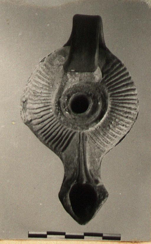 Triangular nozzle, sunken base, and knob on right side. Ribs on the rim; low raised band about the small discus.