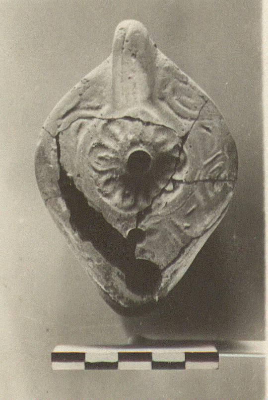Wavy lines on rim; rosette on discus. Handle grooved; unpierced.