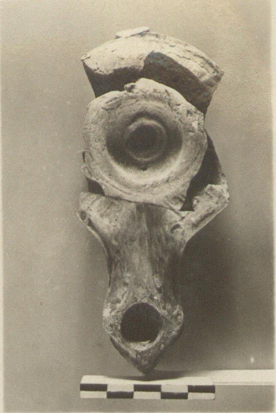 | Description: | Handle and much of sides missing. Raised ring around top; broad tongues on upper body. Poor red to brown glaze, much peeled. Type XVIII (post Sullan) of Corinth collection, type 52 variant of Agora collection. | |
