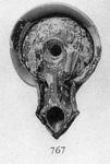 | Description: | The handle broken off; and part of the raised edge. Chips missing. Wreath in relief on top, surrounded by a high edge; suspension handle, attached either side of filling hole towards nozzle. Air hole at back of top. Signature in raised letters on slightly sunken reverse: "ΛΟΠΑ". Purplish wash. Pinkish-buff clay. Type 54A of Agora collection. | |
