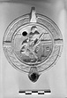 | Description: | Intact. On rim, panelled guilloche enclosing leaves. On discus, Hermes left, a cloak over his left shoulder, the caduceus in his left hand, leading a ram by the horns. Stele at left crowned by cap. Altar at right, on which stands a pinax that seems to represent a running winged figure. Signed below, within low ring foot and beneath an elaborate ornament. Unglazed. Pale buff clay. Type XXVII of Corinth collection. <graphic> | |