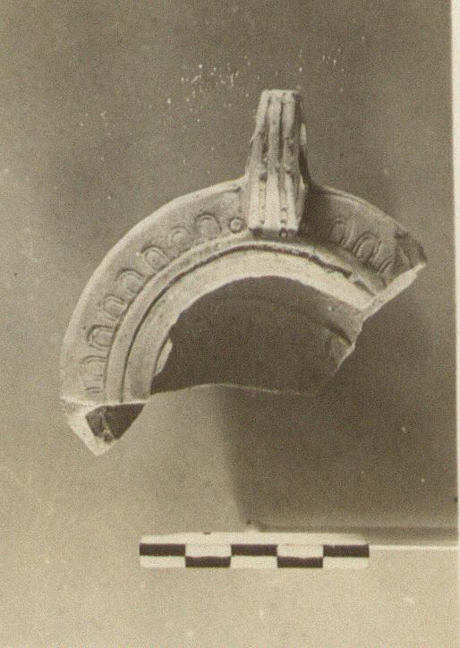 | Description: | Preserved, only handle and part of rim, walls and base. Flat base outlined by a groove; tongues on rim. Orange-red glaze, much worn. Pinkish clay. Type XXV of Corinth collection. | |