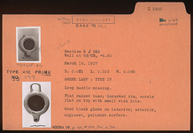 | Description: | Loop handle missing. Flat raised base; incurved rim, nozzle flat on top with small wick hole. Good black glaze on interior; exterior, unglazed, polished surface. Type IV of Corinth collection, type 21C of Agora collection. | |