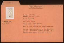 | Description: | Part of rim, discus and handle remains. On rim, tendrils broken by herringbone panels. On discus, a standing heavily draped male figure attacked by a bear. Type XXVIII of Corinth collection. | |