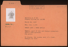| Description: | Handle, part of rim and discus preserved. Handle semi-pierced. Rim plain. On discus, the square sail of a boat. Damaged by fire. Type XXVIII of Corinth collection. | |