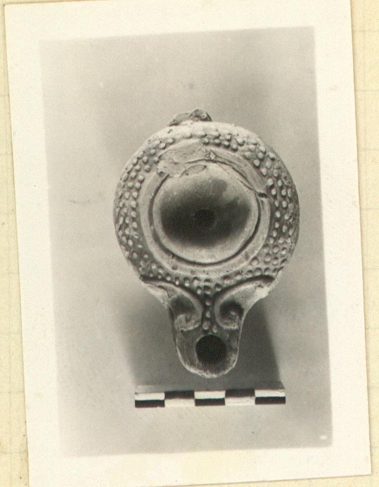 | Description: | Handle missing. Similar to L 2844 (X 271), but from a different mould. Signed: "alpha". Thin black wash. Red clay. Type ΧΧ of Corinth collection. | |