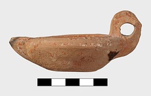 | Description: | On rim, ovules; on discus in relief, stag running right. Red glaze over white. Type XXV of Corinth collection. | |
