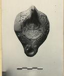 | Description: | Intact except for front part of rim and nozzle; worn. A mold for the upper portion, with solid handle. Discus has female bust, facing, with crescent moon above shoulders. Rim has globules and wavy line. Rather coarse light-red clay. For lamp of type XXIX of Corinth collection. ADDENDA 22 March 1950: A second fragment (section Π 699), Old Cut, layer 2-3, found; joins first, giving mold complete except for chips. | |