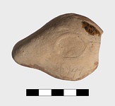 Shallow angular body. On rim, palm branch and raised dots; on discus, conventional design of lines and dots, extending along channel to nozzle.