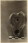 Shallow angular body. On rim, palm branch and raised dots; on discus, conventional design of lines and dots, extending along channel to nozzle.