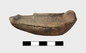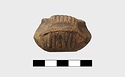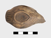 | Description: | Part of end of nozzle broken; otherwise intact. Plain discus with small central filling hole; raised ring aroud it. On rim, ovules. Between nozzle and discus, grooved tongues. Handle, broad, solid with seven grooves above and three grooved tongues below. On reverse, slightly raised oval base ring. Very thin dull black to brown glaze. Imitation of Hellenistic type. | |