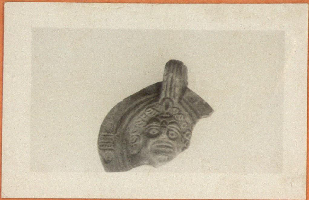 | Description: | Rear half only preserved. Rim, panelled with herringbone pattern and circles. On discus, a scowling face in high relief. Handle solid, triply grooved above; doubly below. Thin red glaze. Red clay. Type XXVIII of Corinth collection. | |