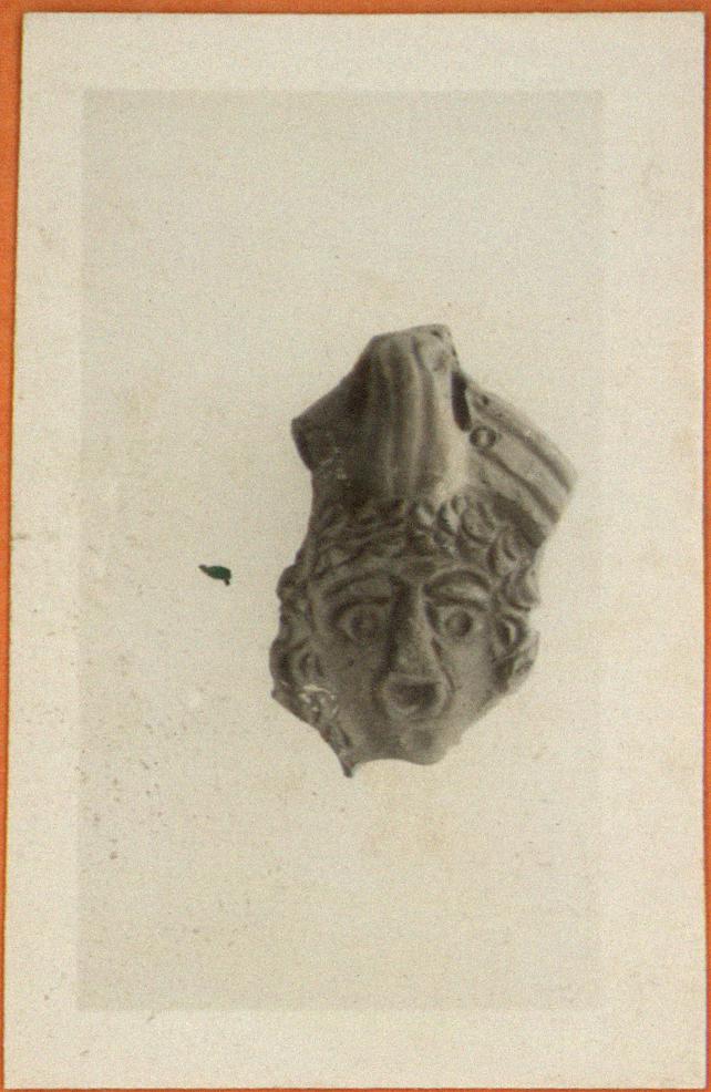| Description: | Handle and part of top preserved. Rim consists of three concentric narrow raised bands. On discus, mask-like face with high piled hair. Handle semi-pierced, double grooved. Unglazed. Red clay. Type XXVIII of Corinth collection. | |
