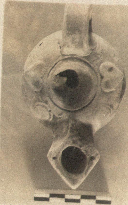 | Description: | Chip missing from top and wall; otherwise intact. Applied band handle; hearts and shields in relief on shoulder. Flat raised base. Remains of thin brown to black wash. Buff clay. Type XVIII of Corinth collection, type 50B of Agora collection. | |