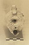 | Description: | Intact except for chips from nozzle. Herringbone pattern on rim, whirling rosette on discus. Solid grooved handle. Circular reverse with double concentric grooves containing small palm branch. Light red clay; wash (?). Type XXVIII of Corinth collection. | |