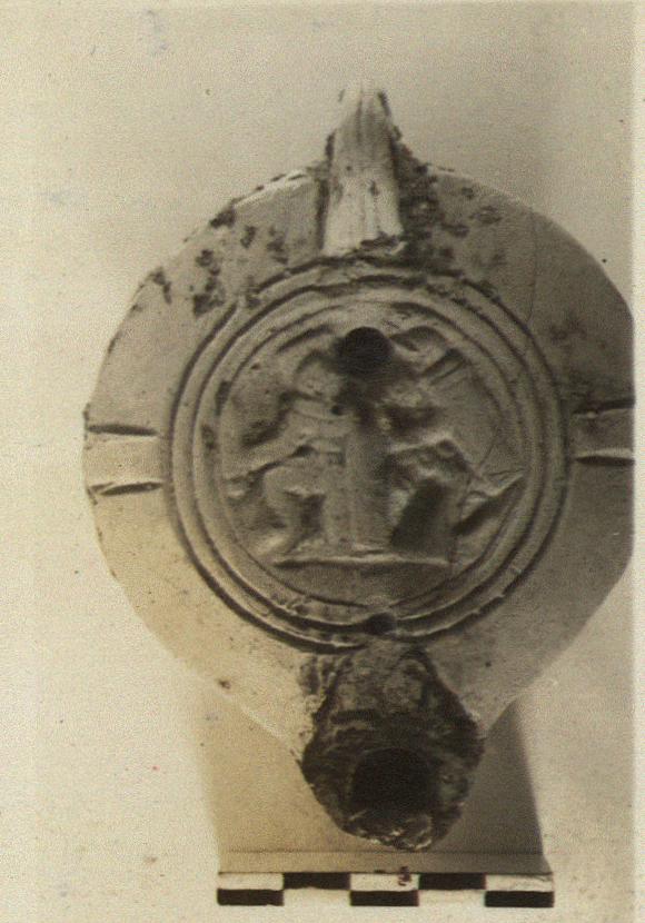 | Description: | Intact save minor fractures. On discus, gladiators. Rim, plain, with panels. Handle pierced, three grooves above, two below. On reverse, single circular groove. Unglazed. Pinkish clay. Type XXVII (late type) of Corinth collection. | |