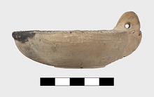 On discus, tongue rosette. On rim, panels, wavy lines, and raised dots. Handle pierced; three grooves above, one below; cross grooves at bottom below.