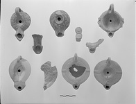 | Description: | Intact. On discus, fine rays. On rim, two grooves and row of dots at edge of discus; then plain with panels. Handle, pierced, three grooves above and two below; ivy leaf at base. On reverse, low ring foot, grooves; rosette. Unglazed. Pale buff clay. Type XXVII of Corinth collection. | |