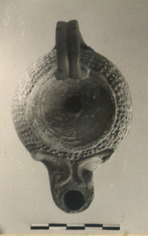 | Description: | Handle missing. Rounded body. Typical dots on body and rim; dull black glaze; underneath, "alpha". Type XX of Corinth collection. ADDENDA Typical example of which many almost complete in Box. | |