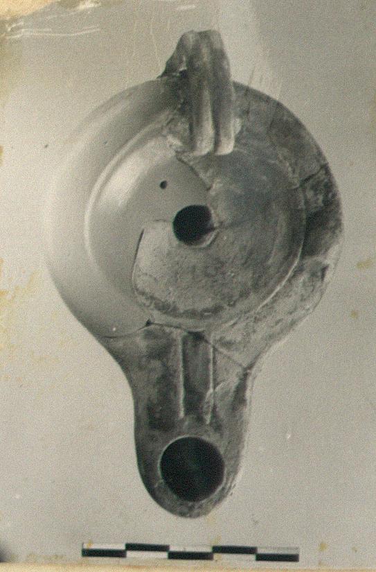 | Description: | One side missing. Plain discus; channel to rounded nozzle; rim plain save for degenerate lug. High grooved handle. Underneath, within raised ring, "alpha". Worn black glaze wash. Type XIX of Corinth collection. | |