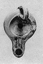 | Description: | One side missing. Plain discus; channel to rounded nozzle; rim plain save for degenerate lug. High grooved handle. Underneath, within raised ring, "alpha". Worn black glaze wash. Type XIX of Corinth collection. | |
