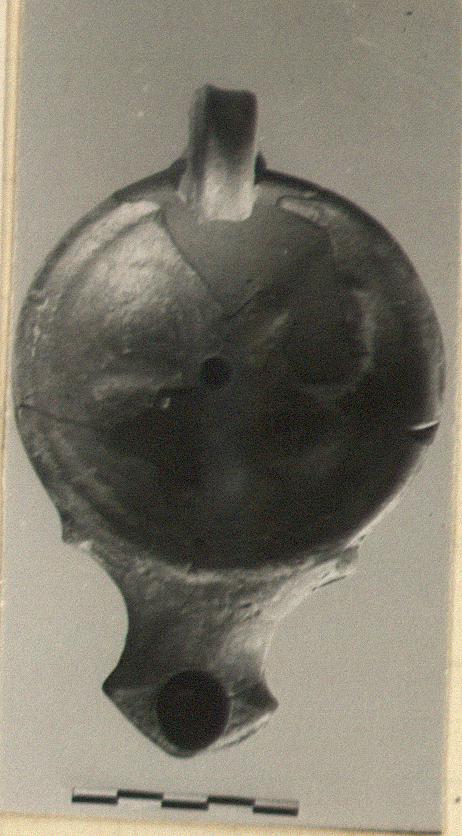 | Description: | Fragments of body and top missing. Relief in center uncertain; large rosette (?). Triangular nozzle. Low ring foot. Brownish glaze. Type XXII of Corinth collection. ADDENDA Fragments similar in Box. | |