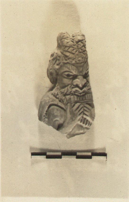 | Description: | Broken away below chest and behind. Pan, holding his pipes with both hands to his chin. Eyes pierced. Thin red paint. Buff clay. Cf. L 710. | |