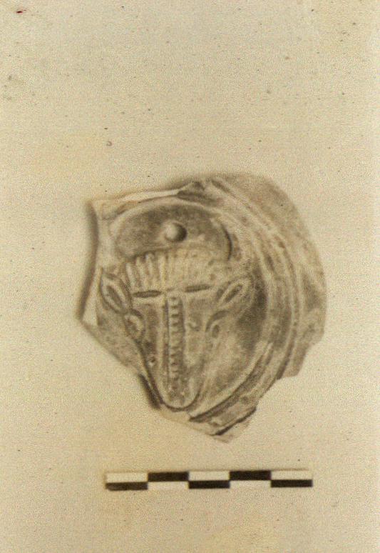 | Description: | Single fragment preserves part of discus with boukranion. Rim plain. Dull purplish glaze. Type XXVIII of Corinth collection. ADDENDA For context cf. Φ 407, (P 10183). | |