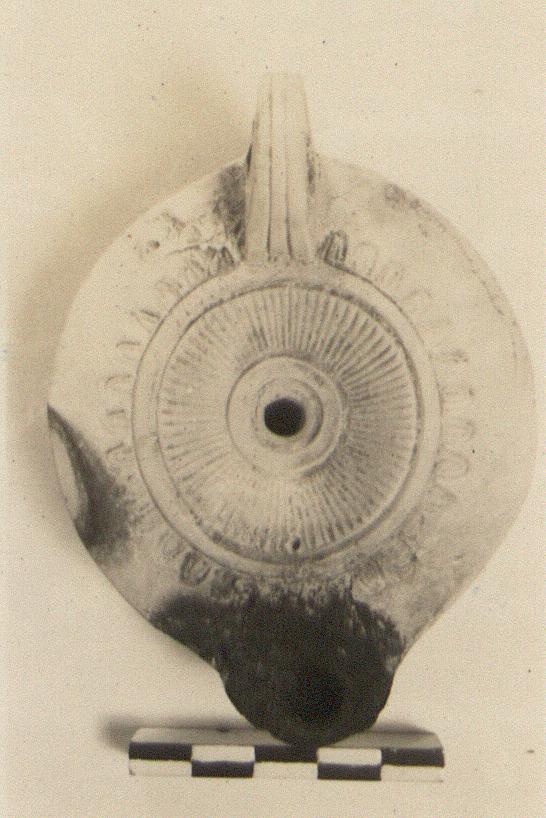 | Description: | Handles pierced. Discus ribbed; eggs on rim. Underneath, within groove, the signature. Unglazed, thin fabric. Buff clay. Type XXVII of Corinth collection. <graphic> | |