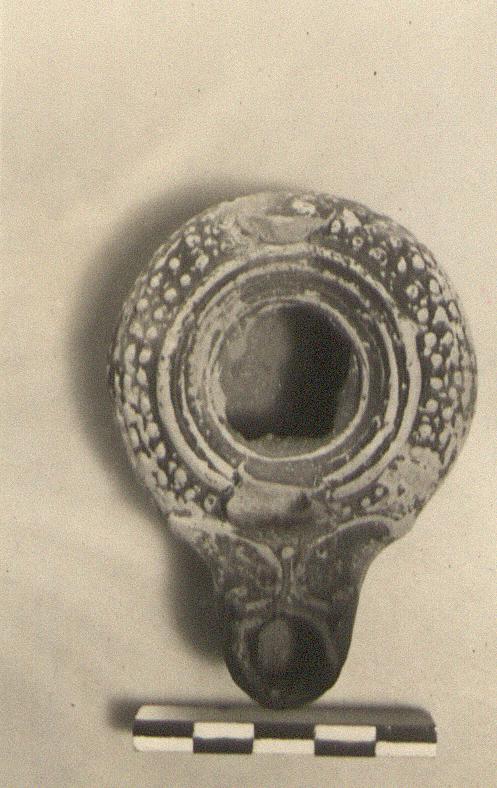 | Description: | The basket handle broken off. Typical globules on body and rim; "alpha" beneath. Red to black glaze wash, worn. Type XX of Corinth collection. ADDENDA Similar to L 3034 (ΠΘ 2492). | |