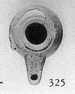 | Description: | End of nozzle broken off, and top chipped. Low base; pierced lug; groove around rim. Glazed inside only. Attic clay. Type VIIB of Corinth collection, type 25B' of Agora collection. | |